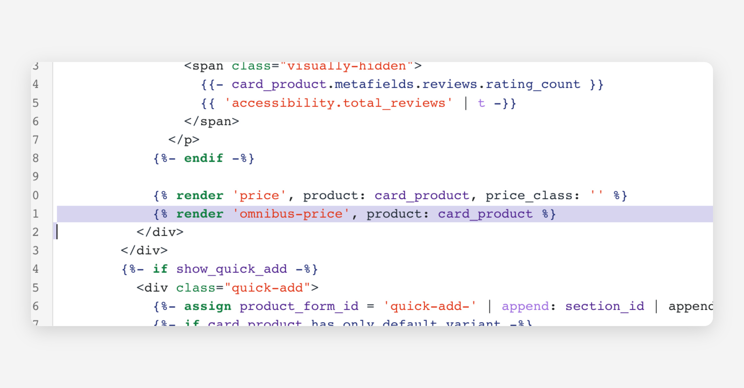 Open up the card-product.liquid source code and locate the spot where you want to insert the omnibus price information.